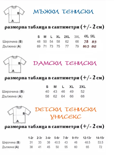 Измерете една Ваша тениска, която Ви е добре като размер и сравнете по размерите в таблицата. Мерете обозначените със стрелки места на схемите по-долу. Изберете размера, който най-много се доближава до Вашият.